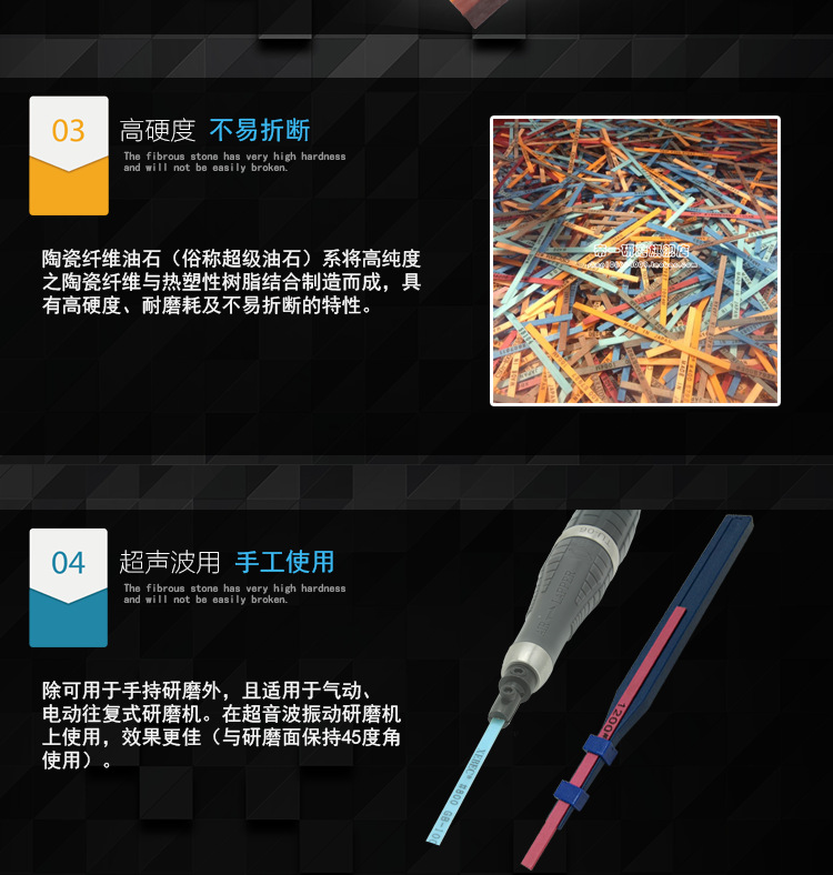 6、除可用于手持研磨外,且適用于氣動、電動往復(fù)式研磨機(jī)。在超音波振動研磨機(jī)上使用,效果最佳(與研磨面保持45度角使用)。陶瓷纖維油石可在各種不同材質(zhì)的模具鋼上研磨加工。最適用于一般難研磨加工處,如窄溝壁、溝底、孔、滑痕、肋部及微小精細(xì)處。尤其對于放電加工后積碳層的快速去除及拋光效果更佳。