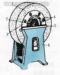 圖 砂輪的平衡 1-砂輪 2-心軸 3-法蘭盤 4-平衡塊 5-平衡軌道 6-平衡架 平衡砂輪的方法:在砂輪法蘭盤的環(huán)形槽內(nèi)裝入幾塊平衡塊,通過調(diào)整平衡塊的位置使砂輪重心與它的回轉(zhuǎn)軸線重合。